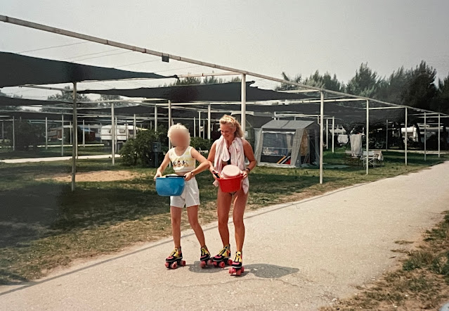 Tässä olemme siskon kanssa vähän lisänneet haastetta tiskipaikalla käymiseen ja laittaneet rullaluistimet jalkaan. Kuva on otettu Venetsian läheltä Camping Mediterraneosta, jossa viihdyimme muistaakseni ainakin kahtena kesänä. Leirintäalue näyttää olevan vieläkin olemassa, ja hienolta paikalta näyttääkin! Jugoslaviassakin tuli käytyä, eikä sitäkään maata ole enää olemassa, kuten ei ole Neuvostoliittoakaan.